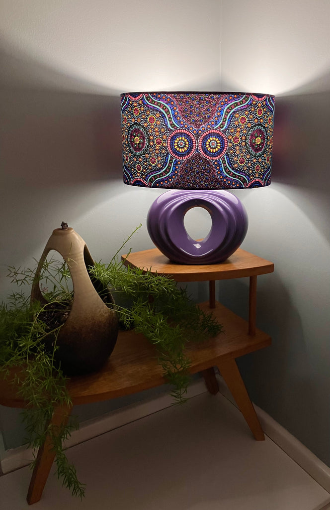 Oval purple ceramic lamp base with an oval lampshade featuring a design by Aboriginal artist ‘Layla Campbell’.