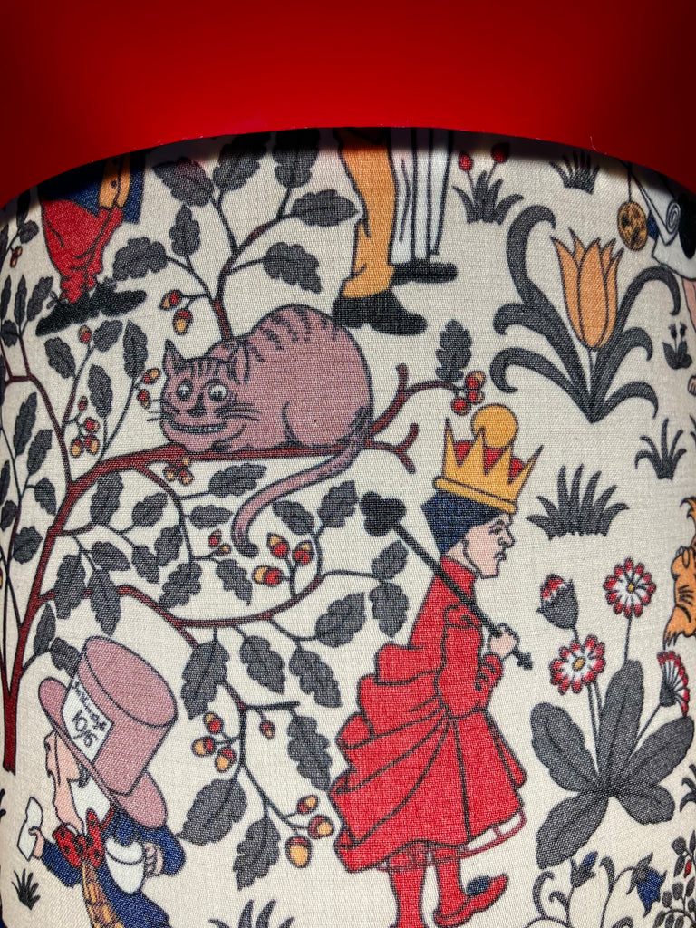 Pale gold metal lamp base with switch on lead, cream fabric featuring Alice in Wonderland an illustration by Sir John Tenniel